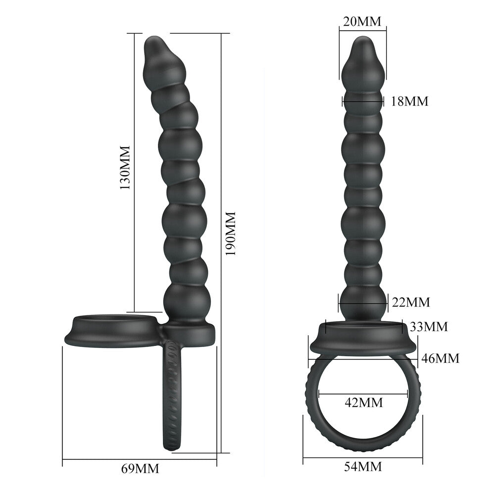 Lo Strap On Dillion combina l’effetto costrittivo alla base del pene con uno stimolatore anale lungo 130 mm con texture ondulate. Realizzato in silicone elastico e vellutato, ha un diametro interno dell’anello di 42 mm, con una lunghezza complessiva del toy di 190 mm. La parte anale ha diametri progressivi da 18 a 22 mm. Impermeabile, flessibile e facile da pulire.